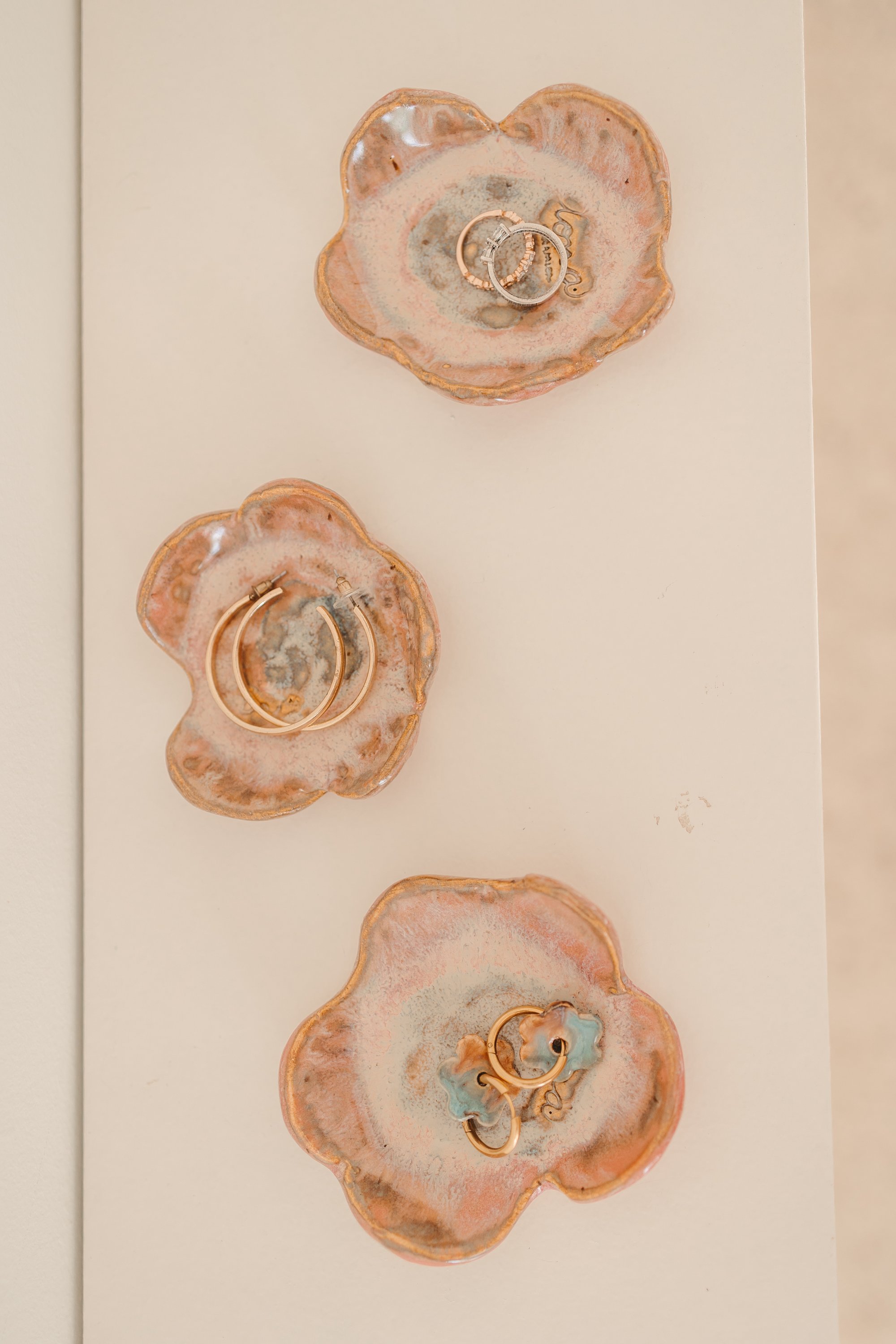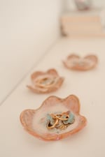 Platet per a joieria fet amb ceràmica blanca d'alta temperatura, elaborada amb la tècnica del pessic. Destaca pels seus detalls amb l'esmalt, i la seva forma abstracta.