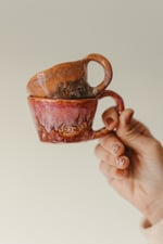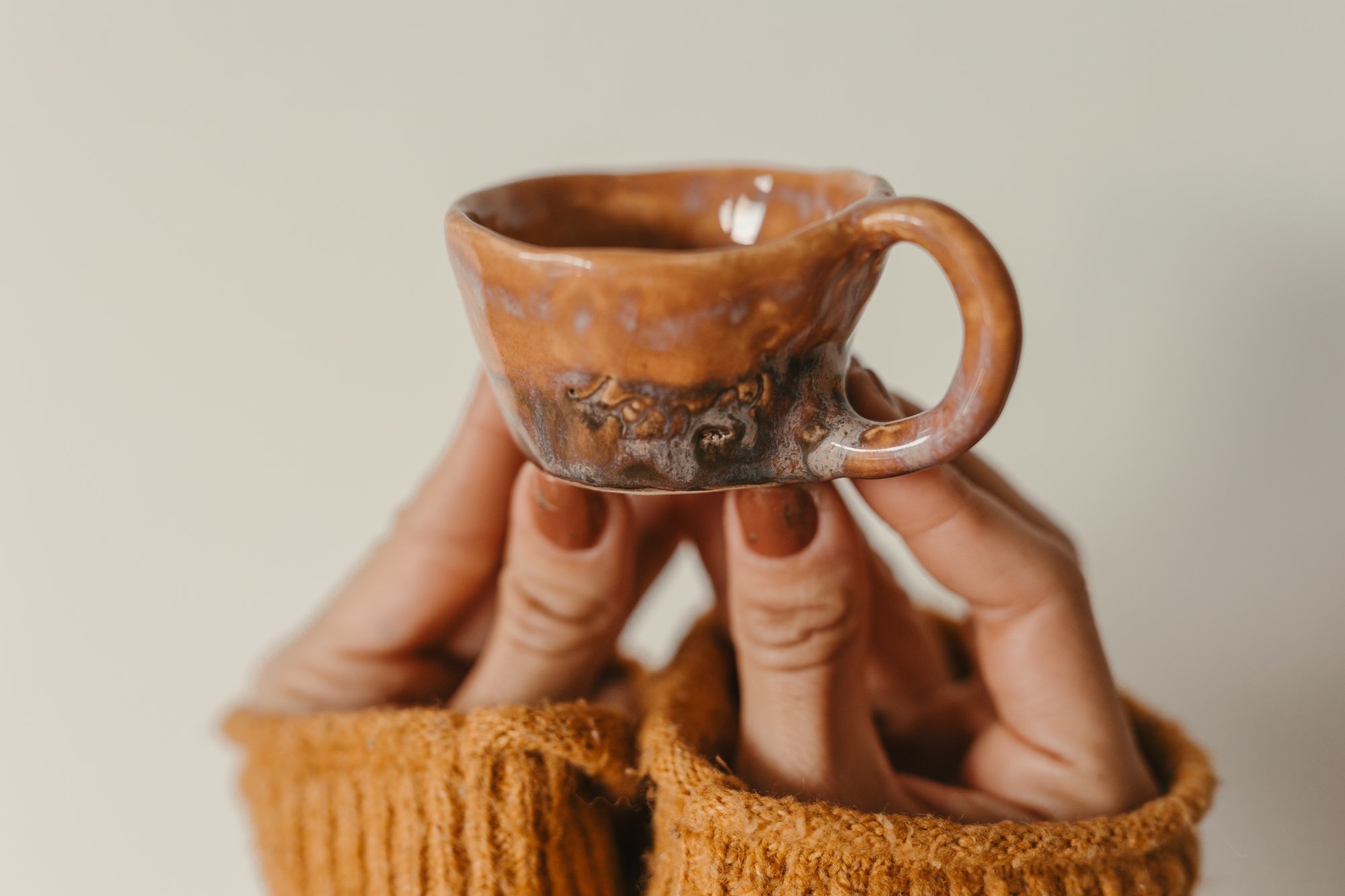 Tasseta petita de cafè feta amb ceràmica blanca d'alta temperatura, elaborada amb la tècnica del pessic. Encara que destaca el color marró, està elaborada amb una fusió de diferents esmalts que fan d'ella una peça més especial. Té una capacitat de 120 ml,