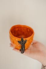 Tassa de 300 ml feta amb ceràmica blanca de baixa temperatura, elaborada amb la tècnica del pessic. Destaca pel seu color taronja i pel detall en les fulles, que fan d'ella una major similitud a la fruita original.