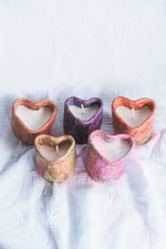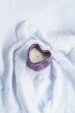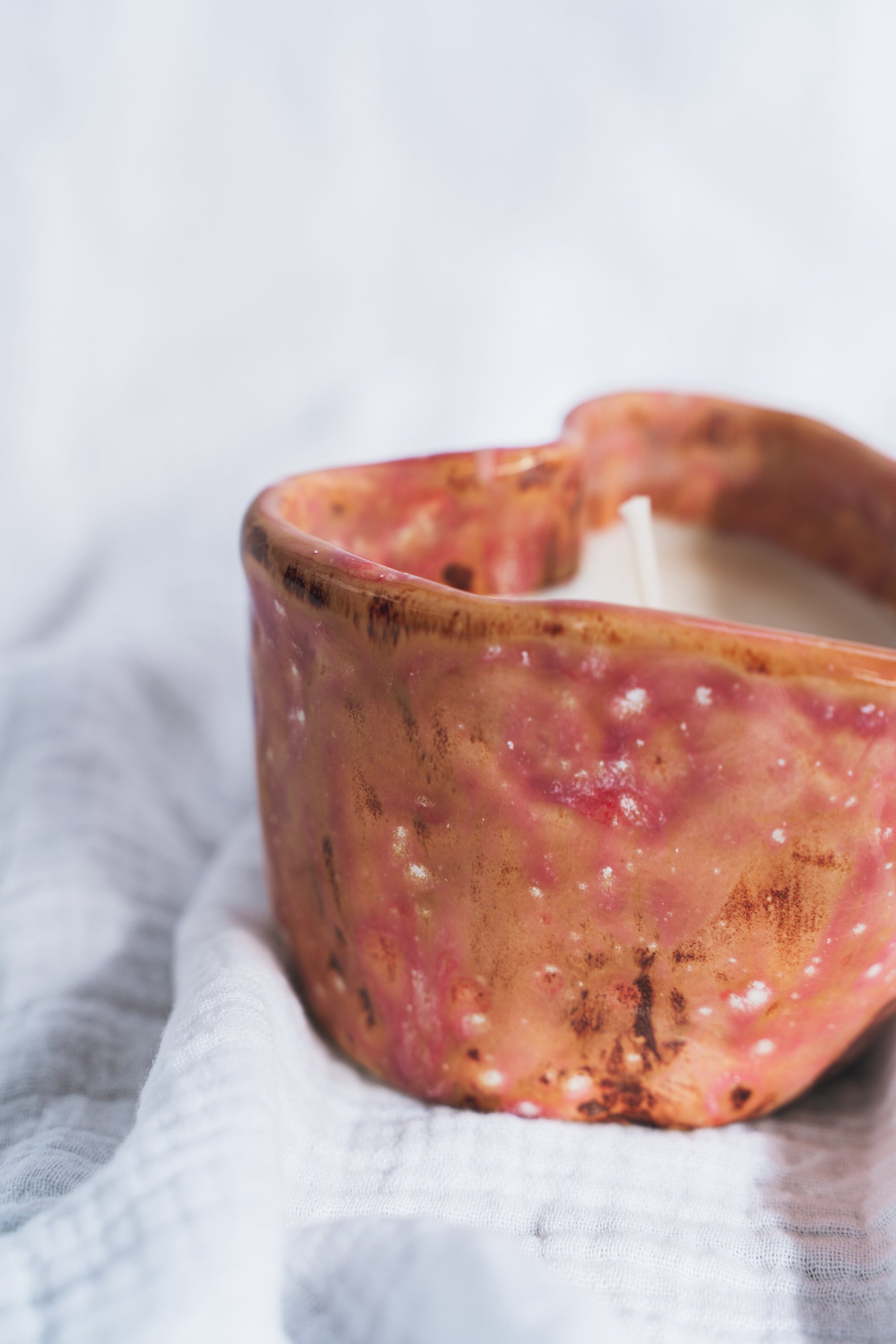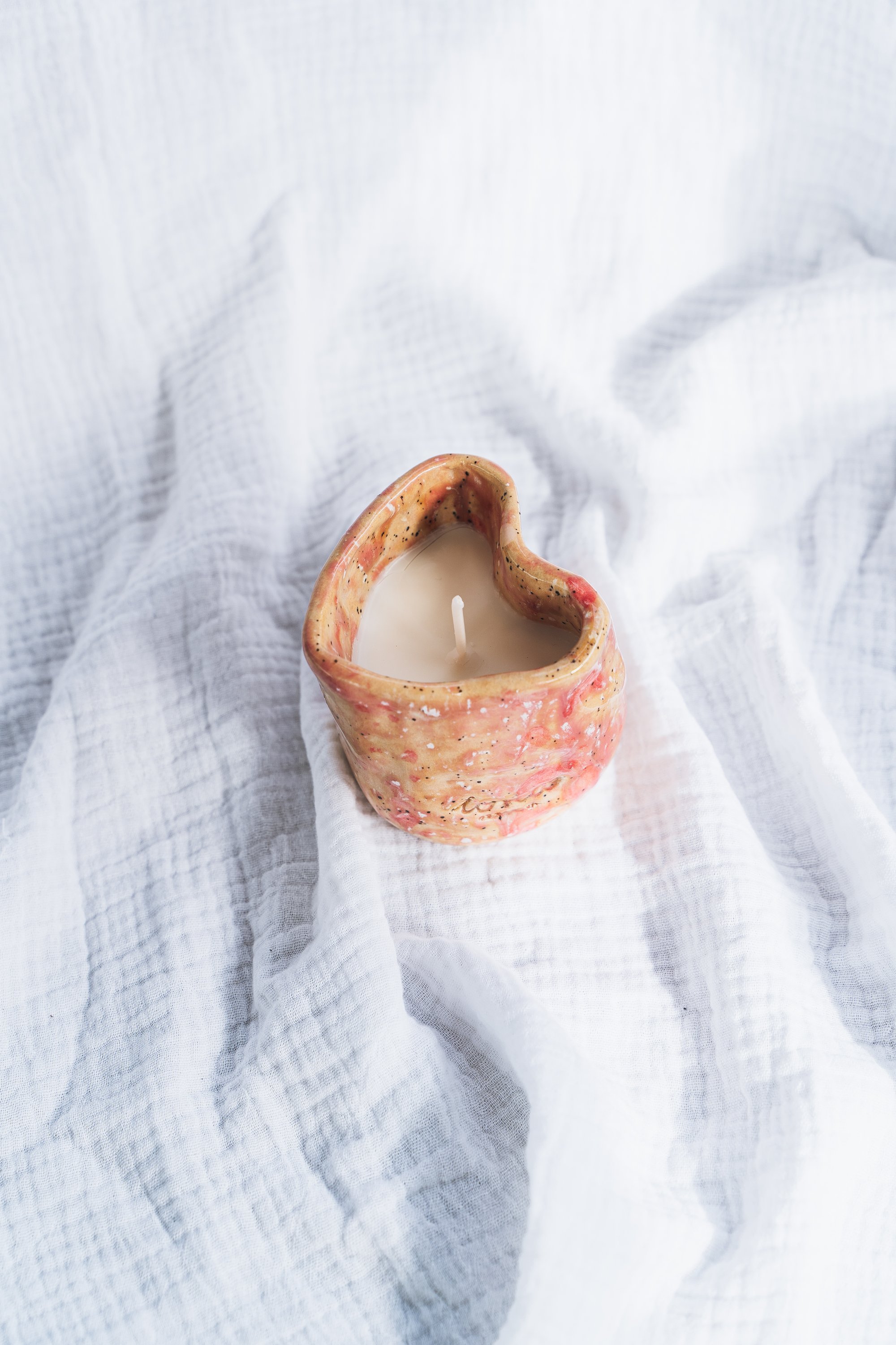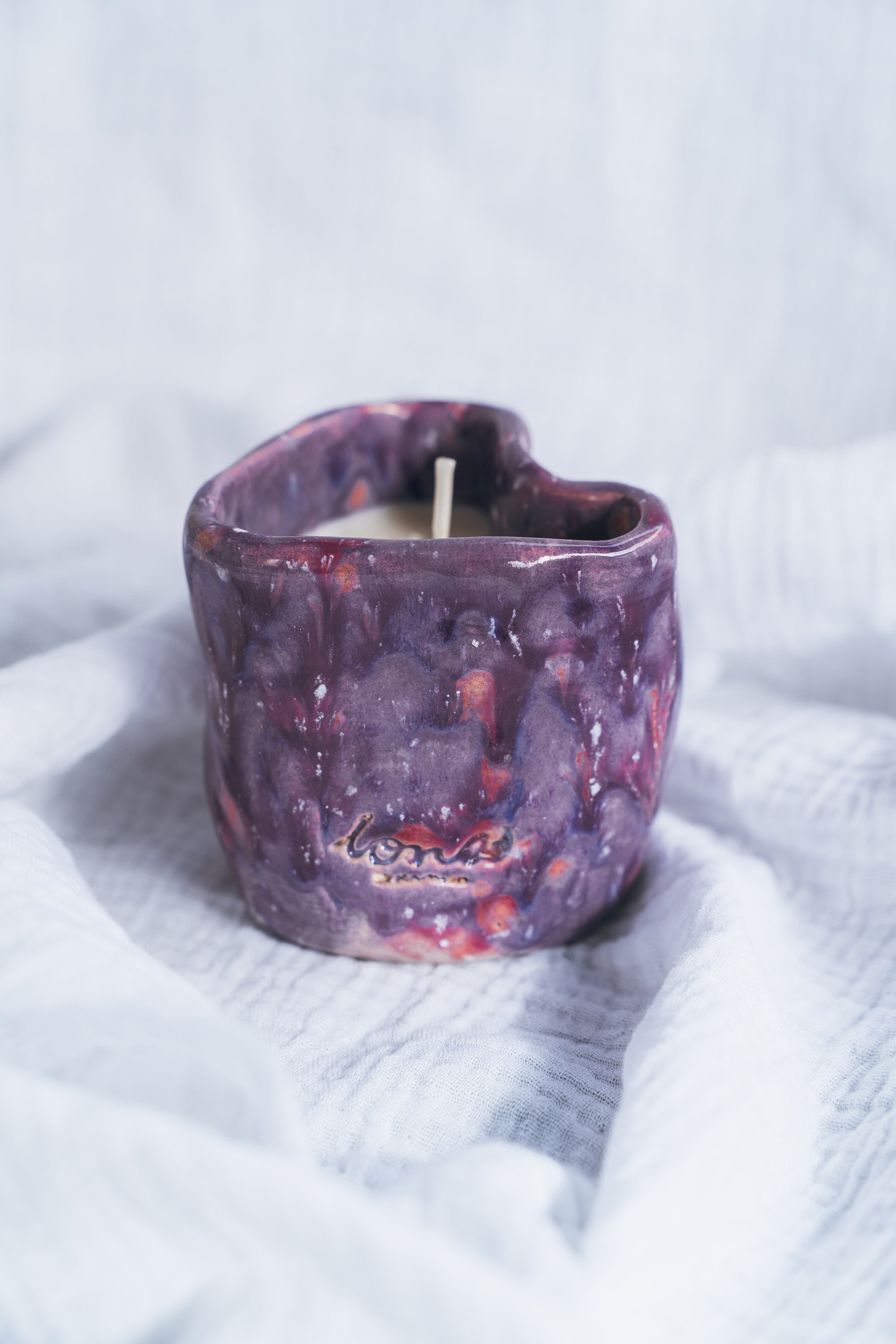 Espelma artesana feta amb ceràmica blanca de baixa temperatura, elaborada amb la tècnica del pessic. Aquesta es troba en cinc colors diferents: lila, rosa, groc, taronja i vermella. Aquesta petita col·lecció d'espelmes, tenen essència de romaní.